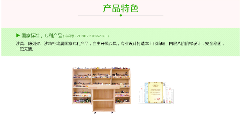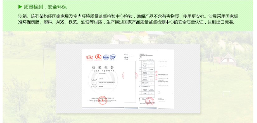 沙箱、陳列架均經國家家具及室內環境質量監督檢驗中心檢驗,確保產品不含有害物質,使用更安心。沙具采用國家標準環保樹脂、塑料、ABS、鐵藝、油漆等材質,生產通過國家產品質量監督檢測中心的安全質量認證,達到出口標準。