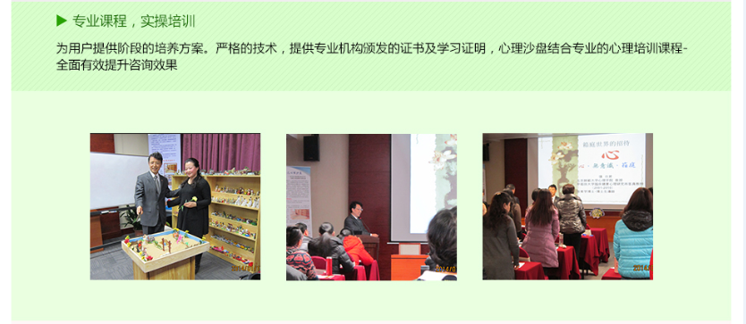 為用戶提供階段的培養方案,嚴格的技術,提供專業機構頒發的證書及學習證明,心理沙盤結合專業的心理培訓課程- 全面有效提升咨詢效果。