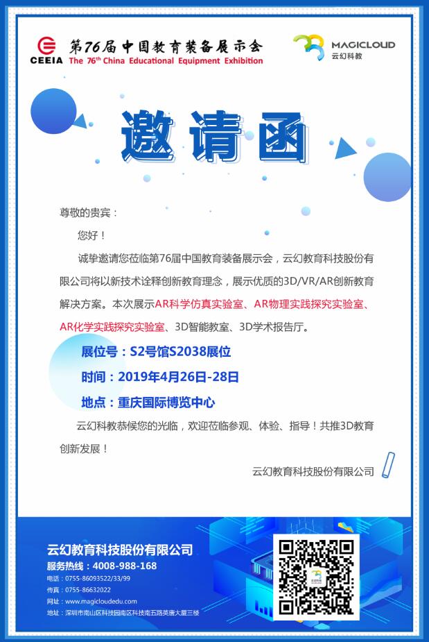 第76屆中國(guó)教育裝備展示會(huì)將于2019年4月26-28日在重慶國(guó)際博覽中心舉辦。云幻科教攜3D/ AR教育解決方案亮相展會(huì),展位號(hào)為S2號(hào)展館S2038展位,歡迎您的參觀體驗(yàn)!
