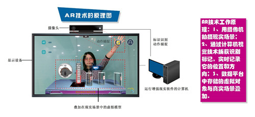 AR利用計算機生成一種逼真的視、聽、力、觸和動等感覺的虛擬環境 , 與現實相融合營造一個沉浸式的教學環境,通過各種傳感設備使用戶“沉浸”到該環境中 ,實現學習者和環境直接進行自然交互,學習者的學和用在同一空間中進行。