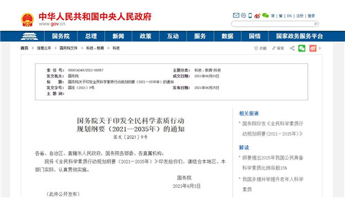 國務(wù)院印發(fā)了《全民科學(xué)素質(zhì)行動規(guī)劃綱要(2021—2035年)》(以下簡稱《科學(xué)素質(zhì)綱要》)指出2035年遠(yuǎn)景目標(biāo):我國公民具備科學(xué)素質(zhì)的比例達(dá)到25%,城鄉(xiāng)、區(qū)域科學(xué)素質(zhì)發(fā)展差距顯著縮小,為進(jìn)入創(chuàng)新型國家前列奠定堅實社會基礎(chǔ)。2020年公民具備科學(xué)素質(zhì)的比例為10.56%,即到2035年我國公民科學(xué)素質(zhì)總數(shù)要增加14.44%。