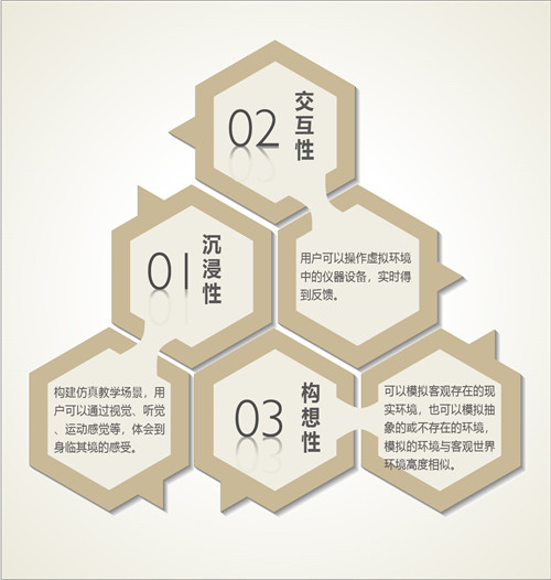 第一個是其沉浸性,構(gòu)建仿真教學(xué)場景,用戶可以通過視覺、聽覺、運動感覺等,體會到身臨其境的感受;第二個是交互性,用戶可以操作虛擬環(huán)境中的儀器設(shè)備,實時得到反饋;第三個是構(gòu)想性,虛擬仿真技術(shù)可以模擬客觀存在的現(xiàn)實環(huán)境,也可以模擬抽象的或不存在的環(huán)境,模擬的環(huán)境與客觀世界環(huán)境高度相似。