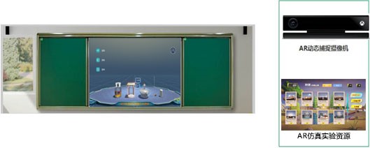 因此,AR理化生地仿真實(shí)驗(yàn)平臺(tái)的搭建非常便利,需要做的只是選擇一間常規(guī)多媒體教室或功能教室(教學(xué)場(chǎng)地),現(xiàn)有教學(xué)設(shè)施(或新建)包括一臺(tái)亮度適中的投影機(jī)、幕布或電子白板、教師計(jì)算機(jī)、電子講桌、音響等(多媒體設(shè)備),也可以是一臺(tái)集成度更好、性價(jià)比更高的多媒體教學(xué)觸控一體機(jī)、推拉組合黑板等,然后增加一臺(tái)體感追蹤攝像機(jī)、伸縮式支架、AR仿真實(shí)驗(yàn)資源及軟件,從而實(shí)現(xiàn)多媒體教室的平滑升級(jí)。