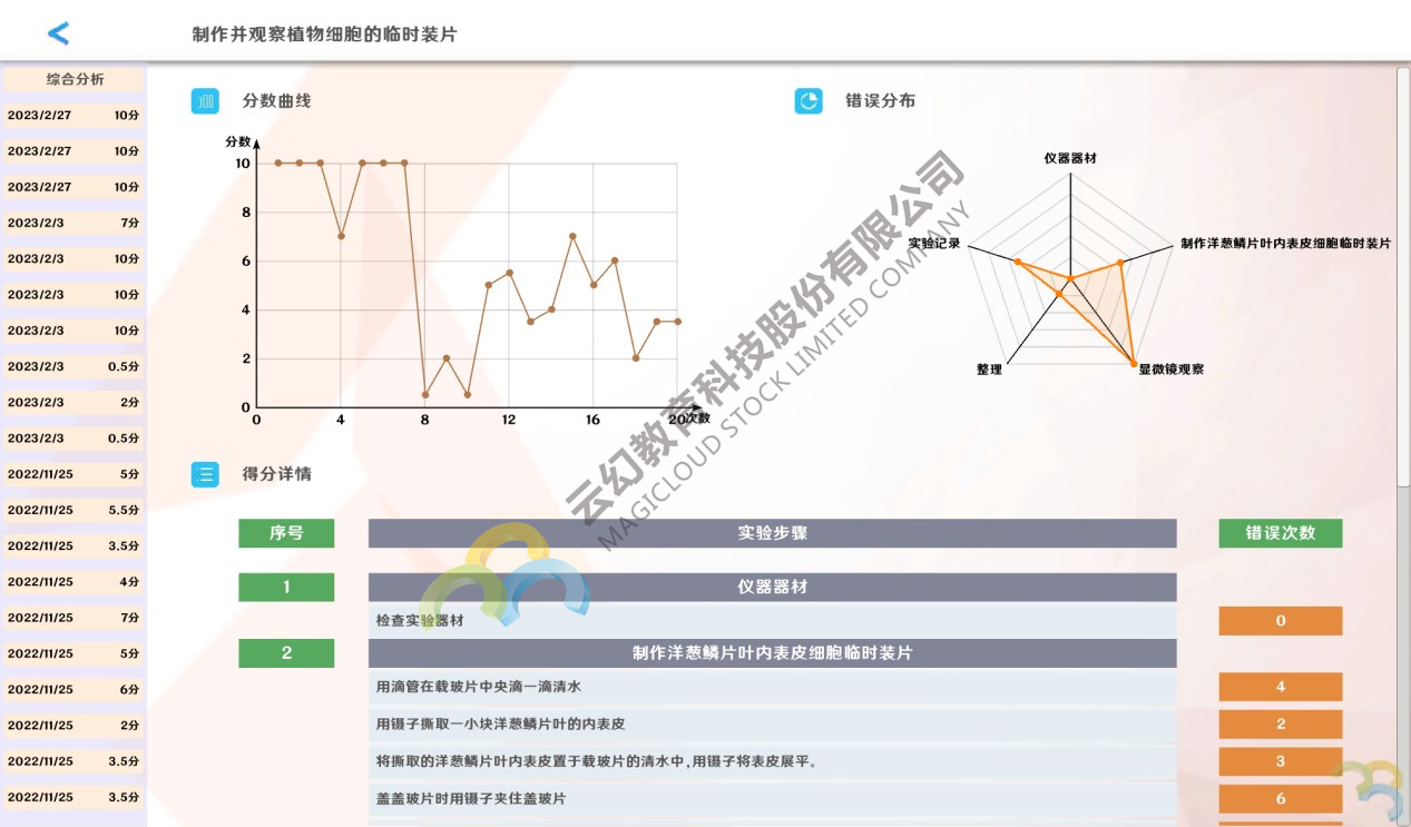 系統記錄學生實驗操作的每一步驟,實驗結束一鍵評分。學生可以通過實驗結果查看錯誤步驟和失分點,不斷練習,直至掌握每一實驗步驟和知識點。