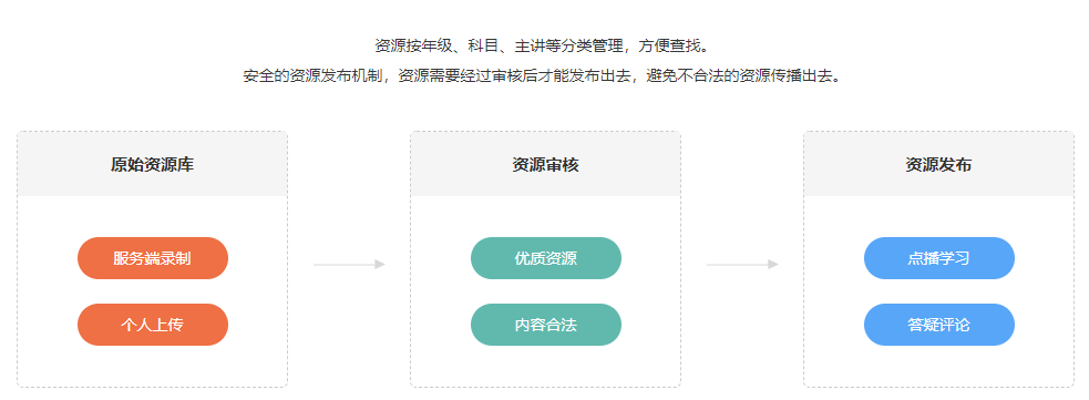 資源管理平臺既可以接收嵌入式設備和網絡攝像機錄制的原始視頻資源,又可以接收微課系統發布的微課視頻以及老師個人整理的各種教學資源。