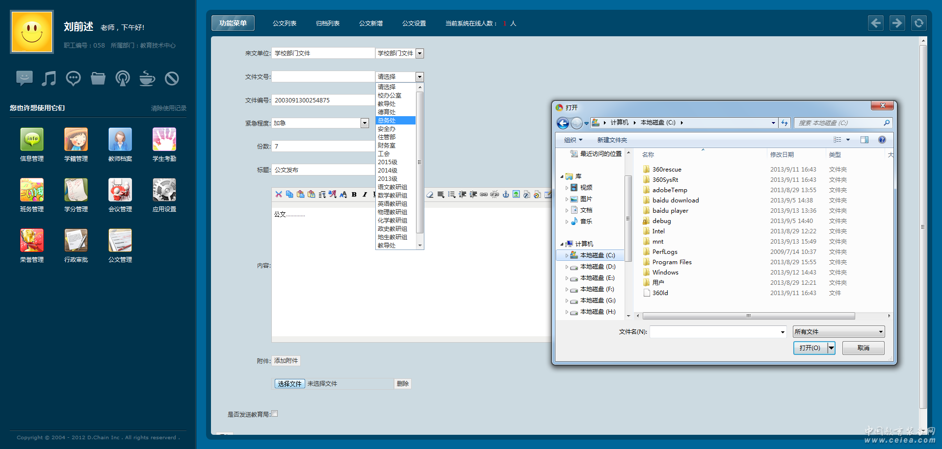 公文管理 根據(jù)每個學校公文的實際流轉(zhuǎn)過程自定義公文流轉(zhuǎn)模板, 進行公文登記;同時可以接受上級教育主管單位的公文信息;在公文流轉(zhuǎn)的過程中,動態(tài)的生成公文的流程圖;公文在流轉(zhuǎn)完成后系統(tǒng)自動歸檔(備注:在公文流轉(zhuǎn)中出現(xiàn)人為操作錯誤可以進行公文撤銷)。