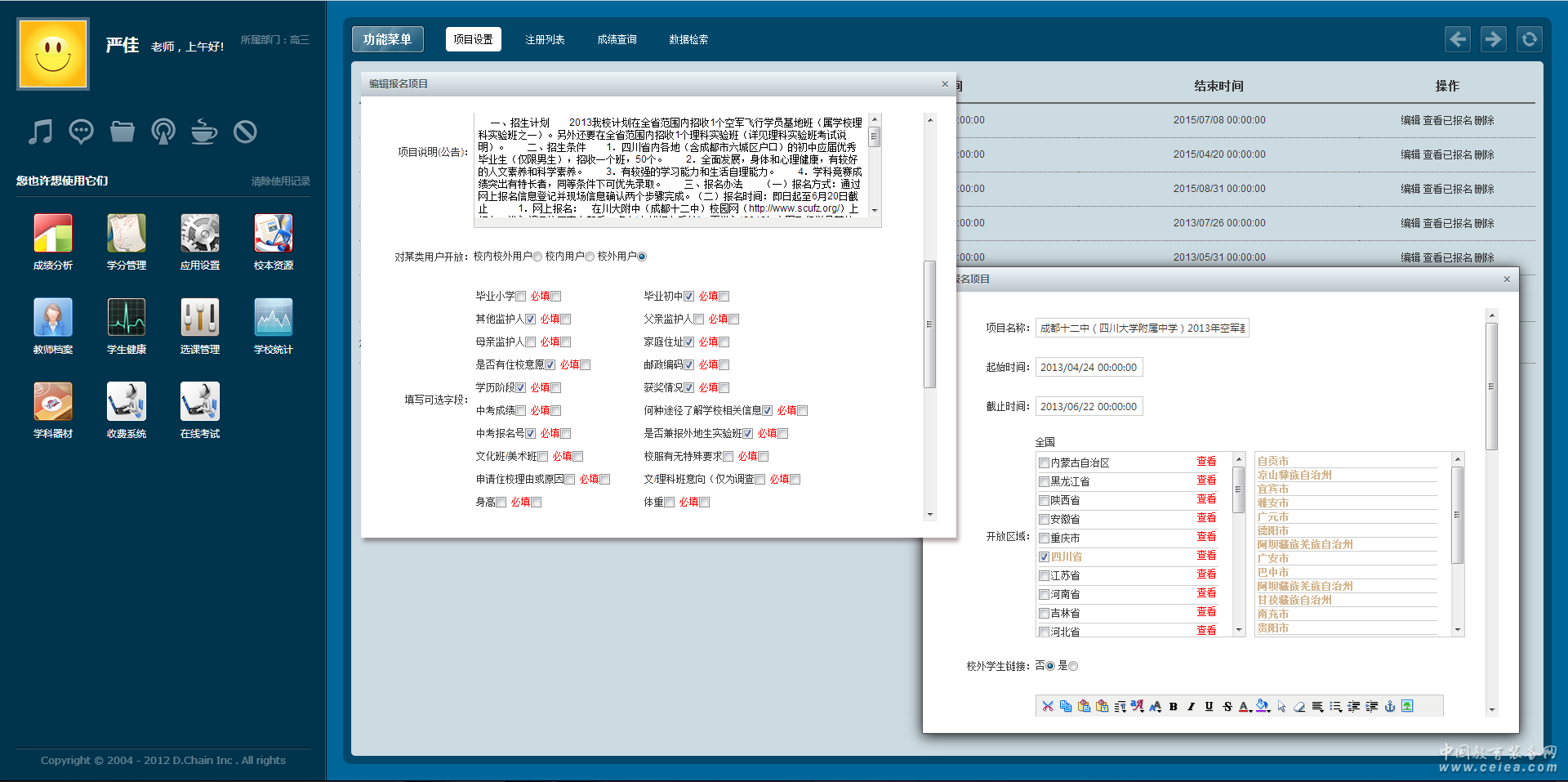 招生管理 首先是新生招生項目的設置(包含招生時間、招生區(qū)域、招生公告、招生學生填報信息自定義、打印模板)、學生報名信息(審核、打印報名)、學生注冊用戶管理(刪除、查看密碼)、學生報名考試成績上傳。 新生報名 主要包含學生在線注冊(采用身份證、郵箱便于密碼找回)、在線填報報名信息、查看報名審核、查看 錄取結(jié)果、完善學生檔案信息、打印學生檔案。 入學須知 主要包含分年度學期的常見問題、校園一卡通情況、自助政策、助學貸款申請、轉(zhuǎn)檔須知、住宿問題、 入學體檢、收費標準、學校位置、乘車路線等信息的設置,學生對以上信息進行查看。 規(guī)章制度 主要包含自定義規(guī)章制度的分類,各種章程信息的靈活設置,學生對設置的信息的查看。 學籍管理 主要包含學生學籍檔案的導入、增刪改查、學籍檔案模板自定義、班級設置、檔案導出、在校狀態(tài)變更、密碼初始化、學籍變更管理、學生學籍號更新、學生照片批量導出、學生畢業(yè)設置。 班級管理 包含了班級增刪改查(班級名稱、年級、班級編號、年度、學期)、班級導入、班主任設置、自定義班級科目及任課教師、復制生成年級所有班級。 年級管理 包含了對年級名稱、靈活設置年級層次、年級編號的設置與管理。 |
