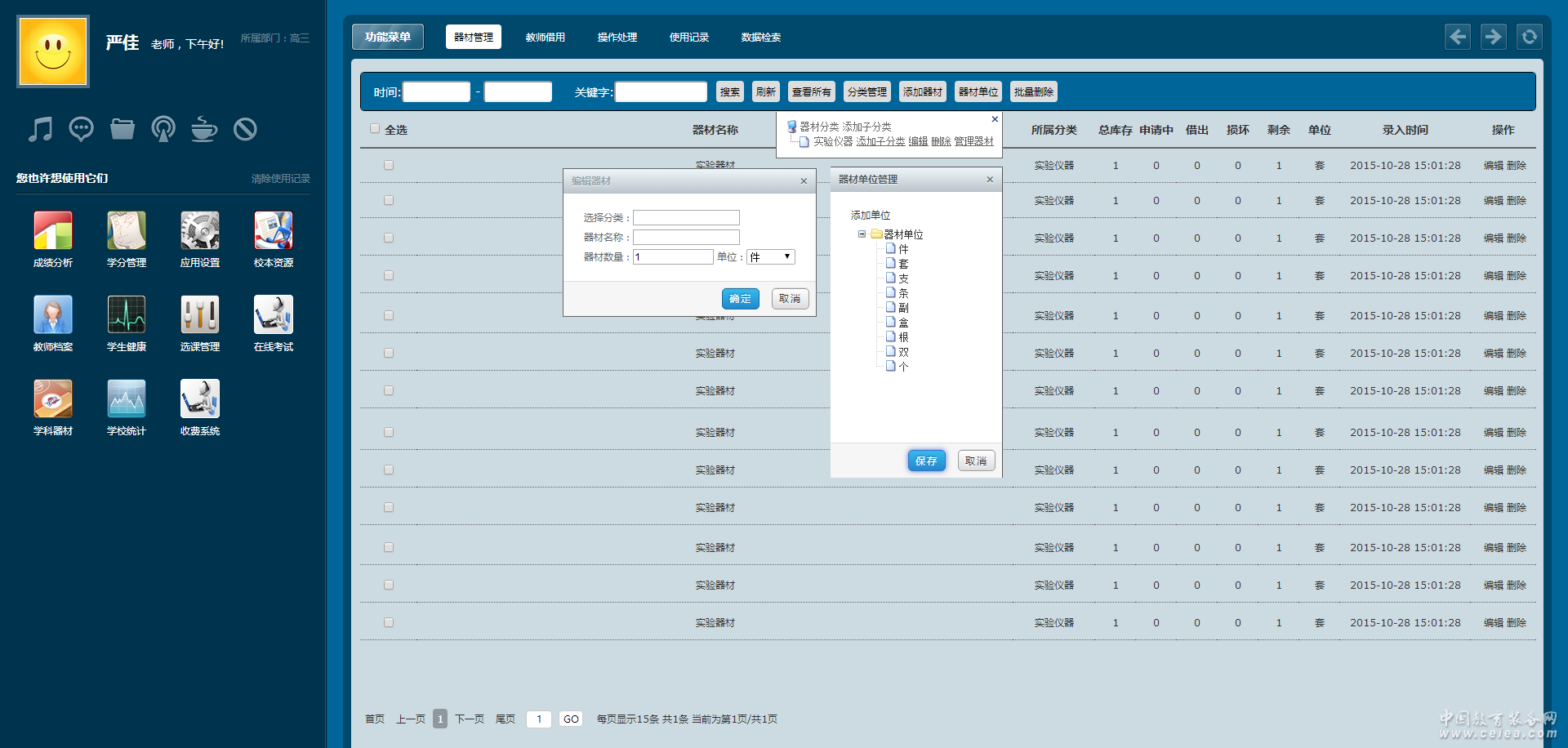 器材管理 實現對器材分類、類型、基本情況等器材信息的綜合管理。 器材借用 對器材使用班級、使用時間、使用教師等器材借用信息的綜合管理。 器材歸還 對器材歸還的時間、保管情況等信息的記錄。 操作記錄 對器材的錄入、刪除、借還等操作類信息的綜合性記錄。 使用記錄 對各類器材使用情況的匯總記錄。 |