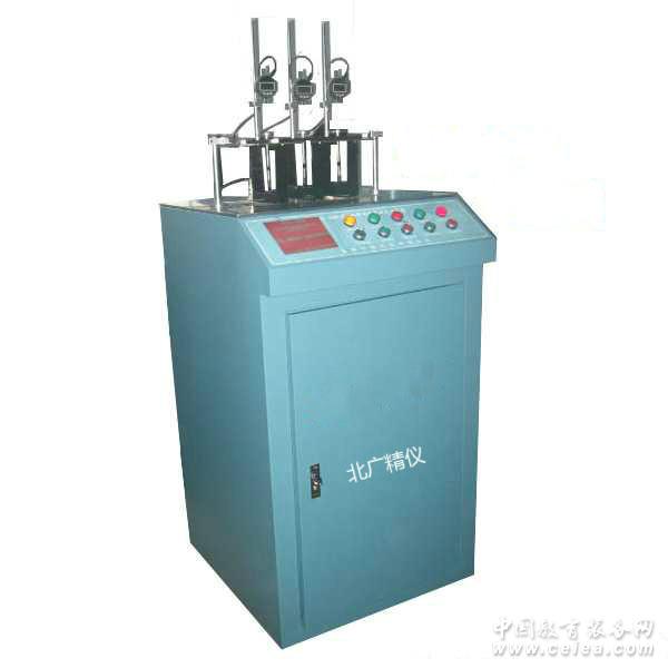 熱變形溫度測定儀廠家安裝與操作說明: 試驗前的準備工作。 根據試驗類型選擇試驗壓頭,熱變形為圓角壓頭,維卡為針型壓頭。將所需的壓頭與負載桿固定好。 根據試驗類型和試樣的尺寸計算載荷: a、熱變形試驗:根據試樣的尺寸,選取載荷b、維卡試驗:只有兩種規定的負荷A法9.81N 即1000g B法 49.05N即5000g 砝碼的選配見(9)砝碼質量表 打開攪拌電機電源,指示燈亮,攪拌電機工作,攪拌速度可以通過攪拌電機控制盒上的旋鈕調節(溫度高時用慢速,溫度低時用快速),按照以上指定的程序檢查電氣,無誤后繼續做下面的工作。 安裝試樣 將試樣架抬(升)出油面,將熱變形試樣放在支撐架上(維卡試樣放在平面上),放下負載桿,將試樣壓緊。 將試樣架放(降)回油池內,將相應質量的砝碼放在托盤上。要求砝碼放正。 將千分表固定在砝碼上方,使千分表內芯懸于砝碼之上,內芯上端有2-5mm的空間。 升溫速率設定:共有兩檔升溫速率,120℃/h,50℃/h。 每次試驗時需要對千分表進行調零,方可進行試驗,調零時輕輕旋動旋鈕,使千分表置于零區,預置3-5分鐘。 啟動工作:當一切準備工作就緒后,試驗開始。 試驗結束,記錄下溫度;移開千分表及砝碼,抬(升)起試驗架,取下試樣。注意不要把試樣誤入油池。 降溫采用氣冷或水冷,也可自然冷卻。冷卻時,可抬起或將試樣架潛入油池。 關閉主機電源、攪拌電機電源。