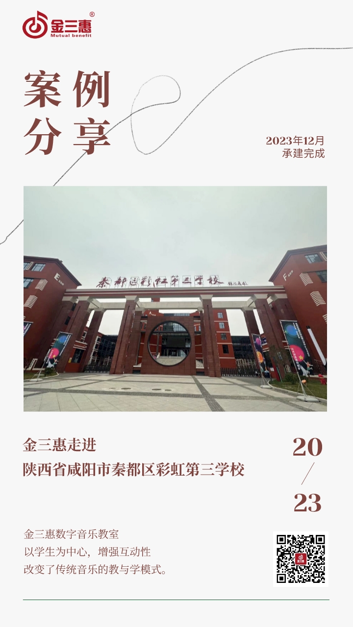 2023年12月,金三惠數字音樂教室走進陜西省咸陽市秦都區彩虹第三學校,為學校提供了4間數字音樂教室,3間舞蹈,1間器樂排練廳,1間鼓號隊。新常態教室-金三惠 (jinsanhui.com)