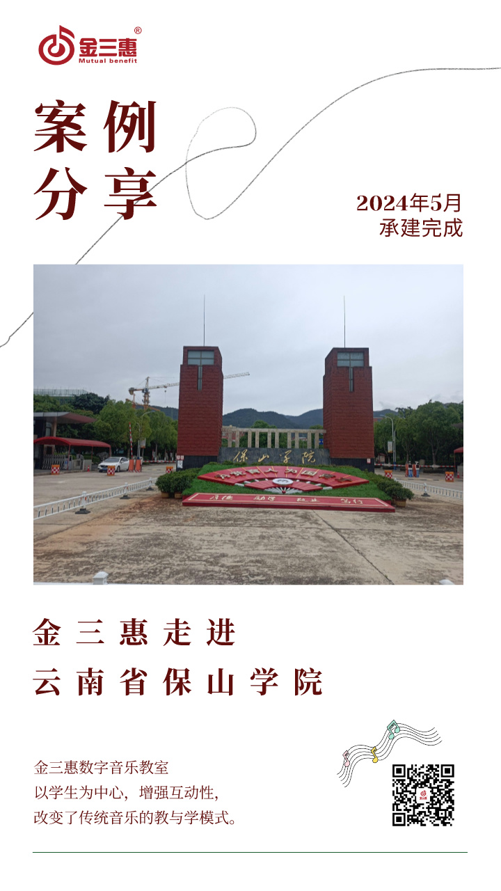 2024年5月,金三惠數字音樂教室云南省保山學院,為學校提供了44+1的電鋼琴教室,配備了金三惠電鋼琴教學系統、電鋼琴、數字音樂教學儀等教學教具等。
