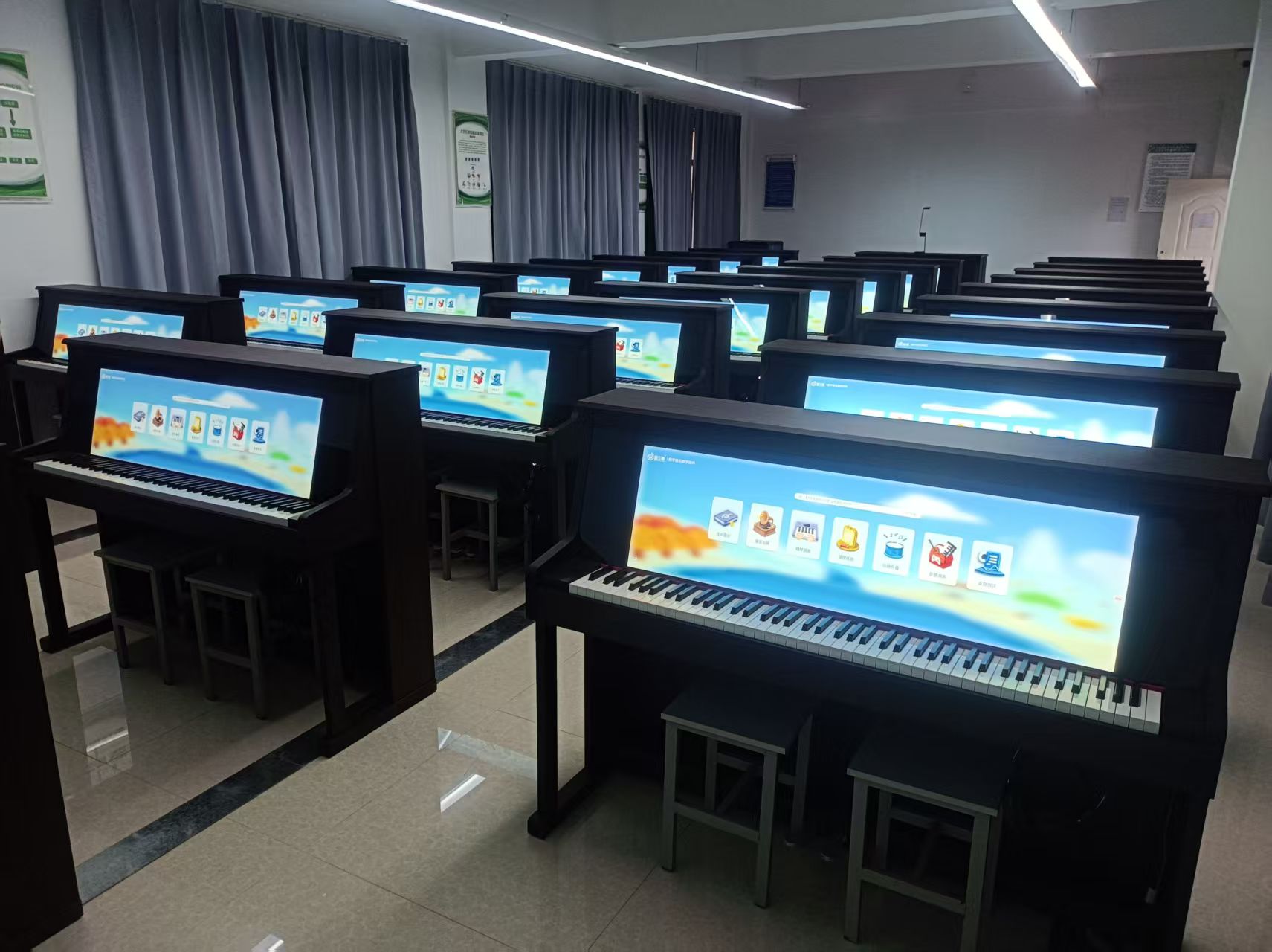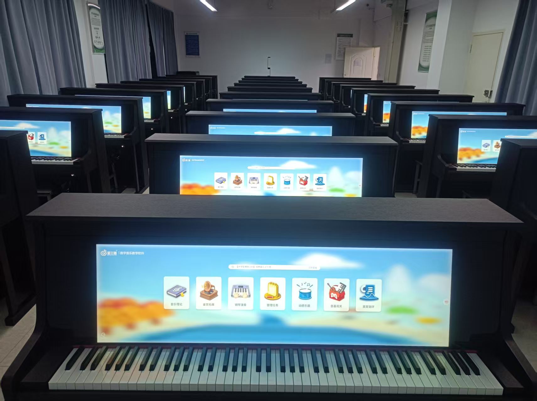 以全面提升學生音樂素養為目標,以智慧電鋼琴為載體搭載數字音樂教學系統,實現學生審美感知、藝術表現、創意實踐、文化理解的全面發展,將核心素養的培養貫穿始終,實現教、學、練、考綜合一體化的智慧音樂素養教室。