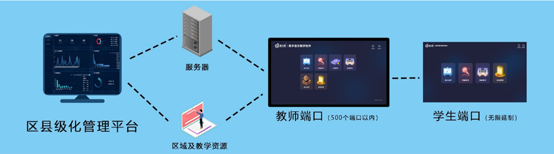 數字化音樂教學平臺是通過區/縣的服務器,建設區級/縣/校級教學平臺,結合配套教學內容,輔助區/縣或學校開好、開齊音樂課,讓孩子享受優質的教學資源,更好的提升孩子音樂知識水平,推進區/縣或學校的美育素養發展。