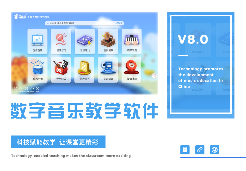 全國數(shù)字化音樂教學(xué)系統(tǒng)的開創(chuàng)者,教學(xué)內(nèi)容包括歌唱教學(xué)、音樂欣賞、教學(xué)管理、音樂測評、樂器演奏、師生互動、教師備課等。