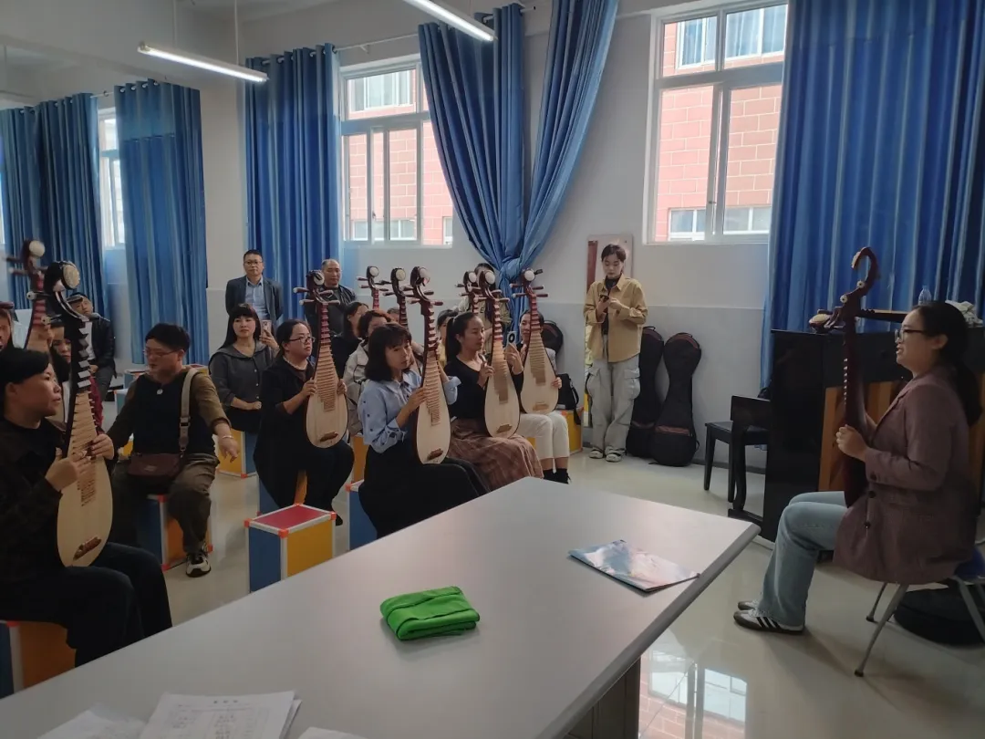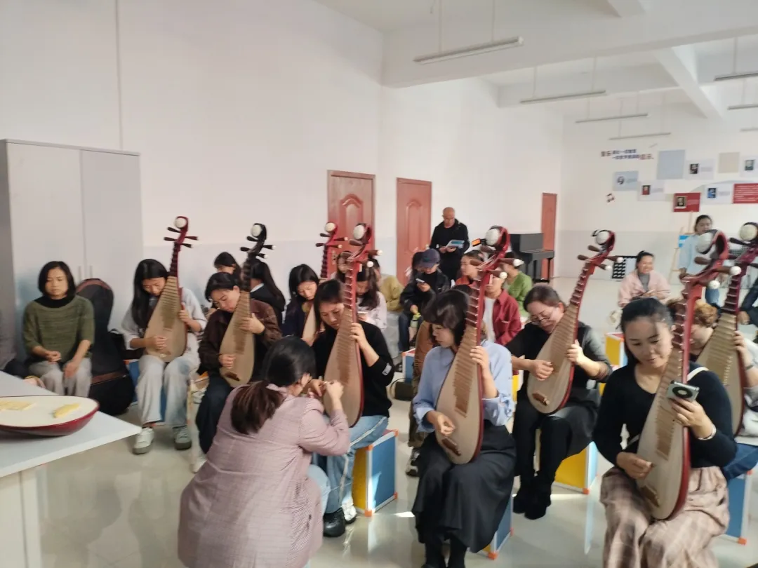 教師們沉浸于練習之中,現場琵琶聲此起彼伏。鄭老師手把手為教師們矯正手勢,調整力度。