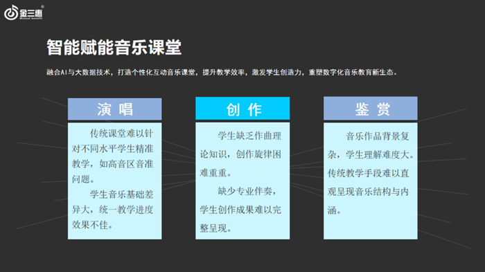 金三惠提供一站式「新常態音樂教室解決方案」「數字音樂教育綜合解決方案」,熱銷產品有:數字音樂教學軟件、美育測評訓練平臺、電鋼琴/電子琴教學管理軟件、電鋼琴教室、智慧音樂素養教室、數字電教板、各大類音樂器材、音樂教學設備等。為區域音樂教育提供管、教、學、評、練綜合平臺,打造智慧平臺+智能硬件+數字資源+智能管控+教學評價為一體的全場景學習生態,實現區域數字化音樂教育轉型。