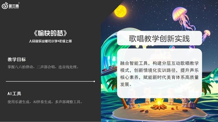 鄭詩垚老師在演講中介紹了金三惠數字音樂教學軟件多種AI功能在歌唱教學中的應用創新。以人民音樂出版社小學4年級上冊《愉快的夢》為例講解了樂譜生成、AI伴奏生成、多聲部調整工具在歌唱教學中的應用,這些創新實踐,打破了傳統歌唱訓練的單一模式,為教師提供了更多的教學手段,融合智能工具,構建分層互動歌唱教學模式,創新情境化實訓路徑,提升聲樂核心素養,賦能新時代美育體系高質量發展。
