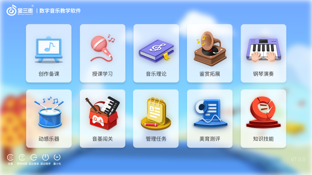 包含創作備課、授課學習、音樂理論、鑒賞拓展、鋼琴演奏、動感樂器、音基闖關、管理任務、美育測評和知識拓展十大功能模塊。
