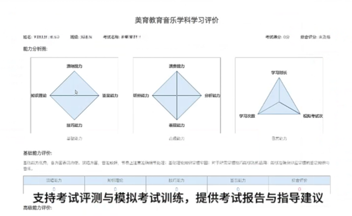 學生做完后,AI會立即批改,生成測評數(shù)據(jù)分析報告,并提供指導建議,報告包括對演唱、演奏、聽辨、知識理論等多項能力的分析,這種即時反饋讓教學有的放矢,也讓學生的學習更加高效。