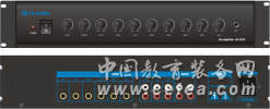 產品詳細介紹功能描述: (1) 多種、多個輸入/輸出口:5個話筒輸入口;3個線路輸入口;2個緊急輸入口;4個輸出口。 (2) 各通道獨立音量控制 (3) 高音和低音音調控制 (4) 自動默音(0-30dB) (5) 緊急輸入無音量控制 性能規格: 設備型號 AS-1211P 話筒輸入(MIC) MIC1 : 600 ohms(Ω) 5mV,不平衡 MIC2 : 600 ohms(Ω) 5mV,不平衡 MIC3 : 600 ohms(Ω) 5mV,不平衡 MIC4 : 600 ohms(Ω) 5mV,不平衡 MIC5 : 600 ohms(Ω) 5mV,不平衡 話筒輸入(EMC) EMC1 : 10K ohms(Ω) 330mV,不平衡 EMC2 : 10K ohms(Ω) 330mV,不平衡 線路輸出 1.0V 頻 率響應 60Hz ~ 15k Hz (± 3dB) 非線性失真THD < 0.01% at 1k Hz 信號噪聲比S/N >70 dB 音調調整 BASS:100 Hz(± 10 dB),TREBLE:12K Hz(± 10 dB) 默音抑制能 MIC輸入時,MIC2~MIC5、EMC1~EMC2、AUX1~AUX3 信號衰減0~30 dB;EMC1~EMC2輸入時,MIC2~MIC5、AUX1~AUX3信號衰減0~30 dB 功能控制 音量調節八個,高、低調節各一個,電源開關一個 指示燈 POWER 保護 AC FUSE X 0.5A X 1 電源線 (3 X 0.75mm ) X 1.5M (標準) 電源 AC 220V / 50 Hz 電源消耗 10~15W 機器尺寸 89(H) X 483(W) X 366(D)mm 包裝箱尺寸 185(H) X 520(W) X 435(D)mm 凈重 5.96kg 毛重 7.62kg |