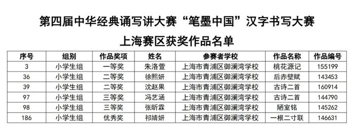 2022年8月,教育部、國家語委主辦的第四屆中華經(jīng)典誦寫講大賽“筆墨中國”漢字書寫大賽,青浦區(qū)御瀾灣學(xué)校朱洛萱、徐熙妍、沈趙果、馮藝涵、張昕霖、祁婧妍6位同學(xué)嶄露頭角獲得佳績。