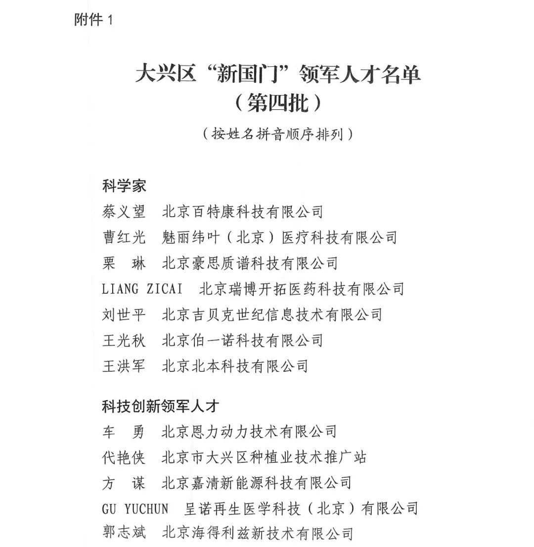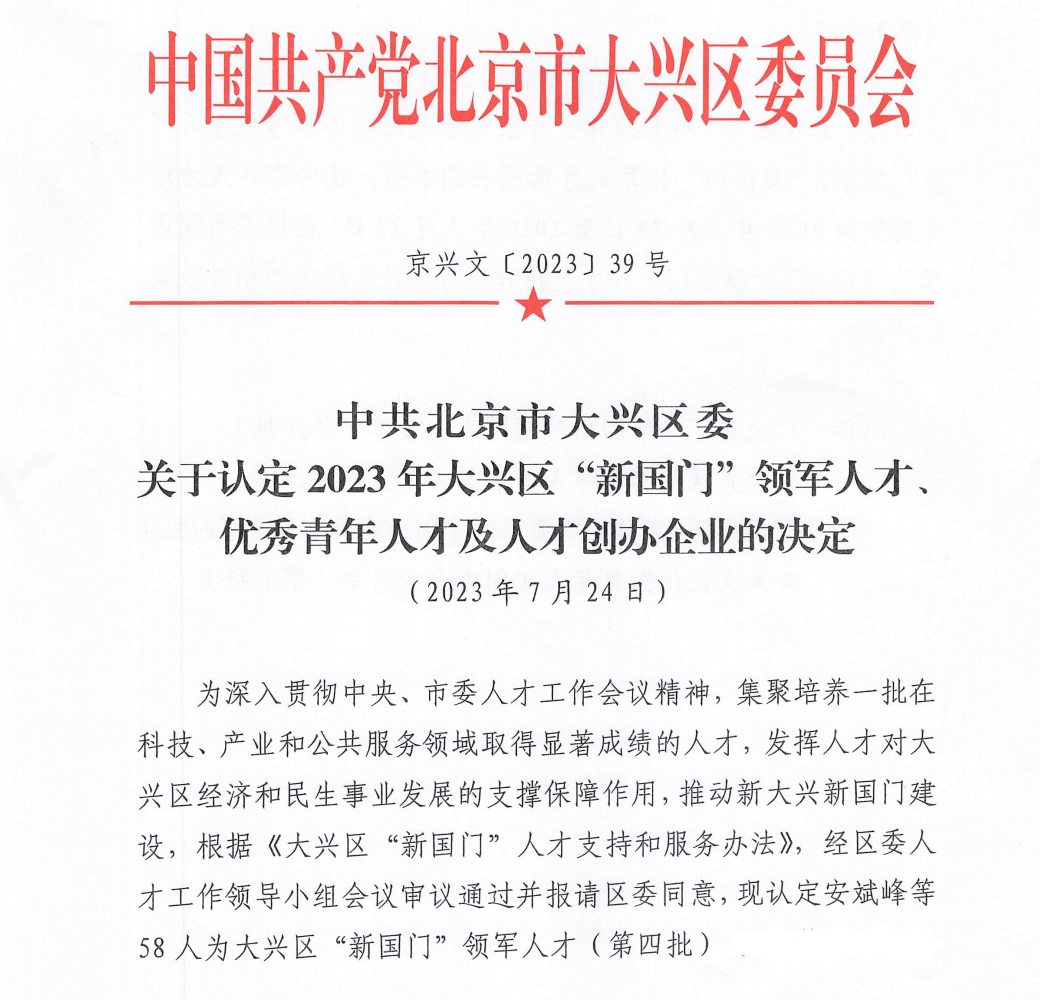 北京市大興區(qū)“新國門”領軍人才稱號
