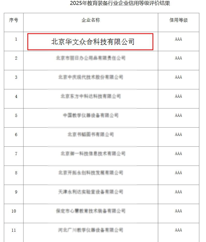 在國家“健全社會信用體系”的政策背景下,北京華文眾合科技有限公司以AAA級信用為標桿,為教育裝備企業樹立了“誠信經營、品質為先”的發展典范。