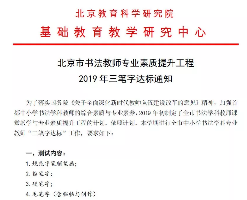 為了落實國務院《關于全面深化新時代教師隊伍建設改革的意見》精神,加強首都中小學書法學科教師的綜合素質與專業素養,2019年初制定了全市書法學科教師課堂教學與專業素質提升工程的計劃,依照計劃,本學期進行全市中小學書法學科專業教師“三筆字達標”工作。