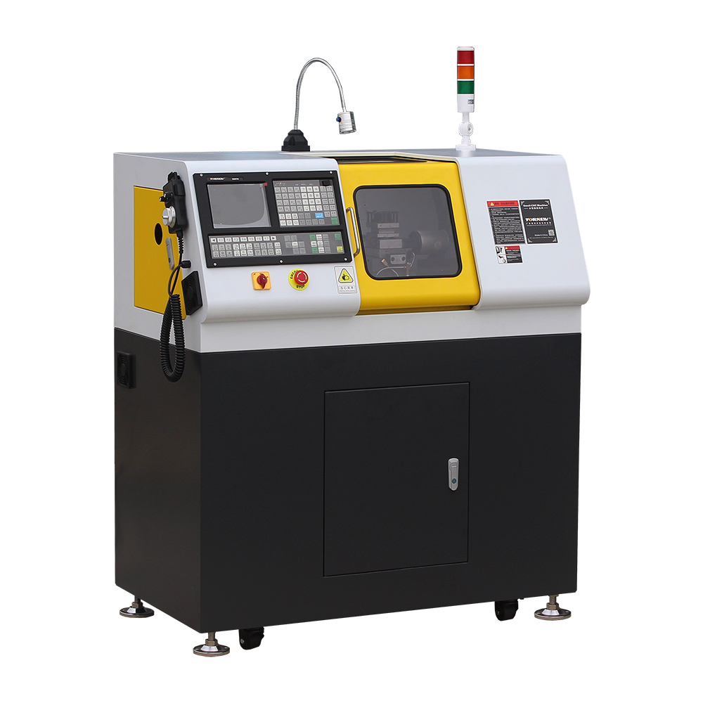 產(chǎn)品詳細(xì)介紹型號:CK210sp 名稱:小型數(shù)控車床 顯著特點(diǎn) 1、標(biāo)配980TB數(shù)控系統(tǒng),運(yùn)行速度更快,確保高速、高效率加工,具備二次曲線插補(bǔ)、橢圓插補(bǔ)、拋物線插補(bǔ)、凹槽加工循環(huán)指令、自動刀補(bǔ)等功能。前置USB接口,前置RS232通信接口,支持U盤文件操作和軟件升級; 2、使用220伏電壓、采用透明有機(jī)玻璃與金屬鈑金全封閉結(jié)構(gòu),提高使用的安全性和觀摩性,采用精選的優(yōu)質(zhì)鑄鐵材料鑄造,床身導(dǎo)軌經(jīng)超音頻淬火后精磨,硬度高、鋼性好,保證機(jī)器的鋼性,采用高精度研磨滾珠絲桿,保證機(jī)器加工精度,XZ各軸配置有集中式潤滑油路系統(tǒng),保證絲桿及導(dǎo)軌使用壽命和加工精度;可自動車削各種回轉(zhuǎn)表面,如圓柱面、圓錐面、特形面等,并能進(jìn)行車螺紋、鏜、鉸加工,效率高、適用性強(qiáng); 3、配有工件冷卻系統(tǒng),可加工鋼件;配置4工位電動刀架,可加工復(fù)雜的零件工藝; 4、配有電子手輪(手脈)、手動操作及對刀操作更方便靈活,配有Led工作燈; 5、數(shù)控系統(tǒng)帶圖形仿真功能,8英寸彩色液晶屏,顯示加工程序的圖形以及實(shí)際運(yùn)行時的刀具移動軌跡,完善的自診斷功能,實(shí)時顯示出現(xiàn)異常立即報警,保證操作安全性; 6、采用ISO標(biāo)準(zhǔn)G代碼編程,支持M代碼及S代碼,全面兼容FANUC,三菱G代碼和多種CAD/CAM軟件( MasterCAM、UG、CAXA等軟件編程等);支持強(qiáng)大的B類宏解析功能,方便用戶開發(fā)自己的運(yùn)動控制程序; 7、主要加工材料有:鋼、鐵、銅、鋁、PVC塑料等材料;
