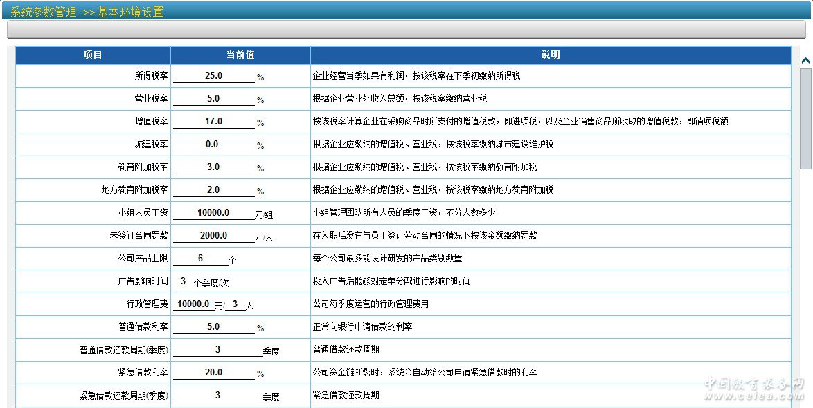 以下對各參數含義及內容進行簡要說明: 所得稅率:每個季度運營如果有利潤,需按此比例繳納所得稅; 營業稅率:企業的營業外收入,需按此比例繳納營業稅; 增值稅率:在原料買賣和產品專賣時,需要按此稅率繳納增值稅; 城建稅率:根據企業應納稅額,按此稅率繳納城市建設維護稅; 教育附加稅率:根據企業應納稅額,按此稅率繳納教育附加稅; 地方教育附加稅率:根據企業應納稅額,按此稅率繳納地方教育附加稅; 小組人員工資:參加訓練的小組學生作為企業的管理團隊,不計人數多少,統一按這個金額支付管理人員的工資; 未簽訂合同罰款:在入職后沒有與員工簽訂勞動合同的情況下按該金額繳納罰款 公司產品上限:每個公司可以針對消費者設計多個產品品牌,這是品牌的上限數; 廣告影響時間:每季投入的廣告在未來若干個季度仍會有一定影響,這是影 響的最大周期數; 行政管理費:每季需要開支的行政管理費用,與公司人數規模有關; 普通貸款利率:正常向銀行申請貸款的總利率; 普通貸款還款周期:銀行正常貸款的歸還時間; 緊急貸款利率:在企業資金鏈斷裂時,銀行會自動向企業發放緊急貸款,利率要遠高于正常申請的貸款;企業不能主動申請緊急貸款; 緊急貸款還款周期:銀行緊急貸款的歸還時間; 同期最大貸款授信額度:在一個季度內,正常向銀行申請的最大貸款總金額; 一賬期應收賬款貼現率:在一個季度后到期的應收賬款,可以提前申請貼現,按此利率支付貼現利息; 二賬期應收賬款貼現率:在二個季度后到期的應收賬款,可以提前申請貼現,按此利率支付貼現利息; 三賬期應收賬款貼現率:在三個季度后到期的應收賬款,可以提前申請貼現,按此利率支付貼現利息; 四賬期應收賬款貼現率:在四個季度后到期的應收賬款,可以提前申請貼現,按此利率支付貼現利息; 市場訂單未完成部分罰金率:所有訂單要求當季度交貨,如未能及時交貨,將根據未交貨產品的合同總額按此比例予以處罰; 市場需求預測提前期:公司在市場分析報告中可以查看到的未來多少季度的需求; 辦公場地所需費用:公司租賃辦公場所,每季度需要支付的房屋租金; 公司注冊費用:公司在設立過程中所需支付的所有費用; 養老保險比率:根據工資總額按此比率繳納養老保險費用; 失業保險比率:根據工資總額按此比率繳納失業保險費用; 工傷保險比率:根據工資總額按此比率繳納工傷保險費用; 生育保險比率:根據工資總額按此比率繳納生育保險費用; 醫療保險比率:根據工資總額按此比率繳納醫療保險費用; 盈利表現:最終評價公司績效的綜合評價分數的其中一項,所占的權重大小; 財務表現:最終評價公司績效的綜合評價分數的其中一項,所占的權重大; 市場表現:最終評價公司績效的綜合評價分數的其中一項,所占的權重大小; 投資表現:最終評價公司績效的綜合評價分數的其中一項,所占的權重大; 成長表現:最終評價公司績效的綜合評價分數的其中一項,所占的權重大小; 綜合評價下限:綜合評價中的五個項目,每個項目最低得分是權重分乘以此系數; 綜合評價上限:綜合評價中的五個項目,每個項目最高得分是權重分乘以此系數; 產品研發每期投入:每個季度在需要進行研發的產品上投入的研發金額; 產品設計費用:每設計或修改一個品牌所需花費的金額; 廠房折舊率:購買的廠房,每個季度按此折舊率計提折舊; 設備折舊率:購買的設備,每個季度按此折舊率計提折舊; 緊急借款扣除分數:每出現一次緊急借款,綜合表現所扣除的分數 每季廣告最低投入:每季度最低廣告投入金額 經營范圍:工商注冊時需要的企業經營范圍的描述內容;