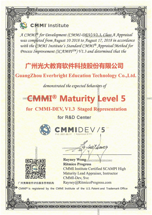 5評(píng)估認(rèn)證的順利通過(guò),不僅證明了光大教育在軟件研發(fā)標(biāo)準(zhǔn)化、規(guī)范化方面表現(xiàn)優(yōu)異,也標(biāo)志著光大教育在過(guò)程組織能力、軟件研發(fā)能力、質(zhì)量管理水平等方面均達(dá)到了國(guó)際一流水平。