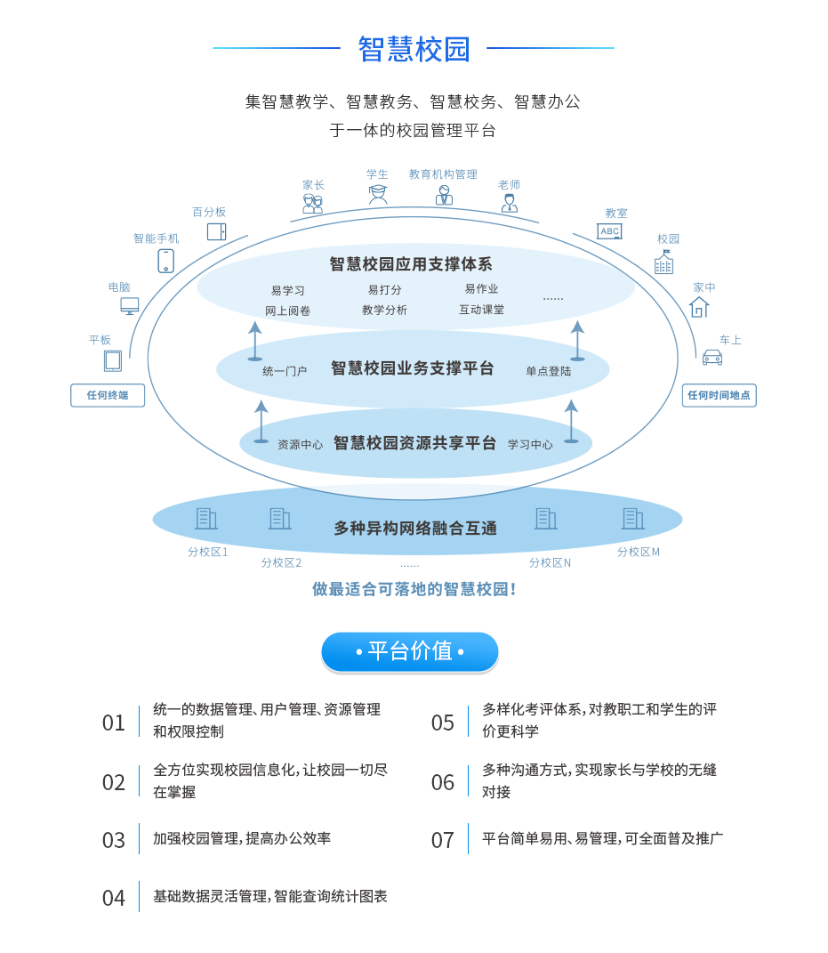 智慧校園是集智慧教學(xué)、智慧教務(wù)、智慧校務(wù)、智慧辦公于一體的校園管理平臺(tái)。平臺(tái)價(jià)值: 統(tǒng)一的數(shù)據(jù)管理、用戶管理、資源管理和權(quán)限控制全方位實(shí)現(xiàn)校園信息化,讓校園一切盡在掌握 加強(qiáng)校園管理,提高辦公效率基礎(chǔ)數(shù)據(jù)靈活管理,智能查詢統(tǒng)計(jì)圖表多樣化考評(píng)體系,對(duì)教職工和學(xué)生的評(píng)價(jià)更科學(xué) 多種溝通方式,實(shí)現(xiàn)家長(zhǎng)與學(xué)校的無縫對(duì)接平臺(tái)簡(jiǎn)單易用、易管理,可全面普及推廣