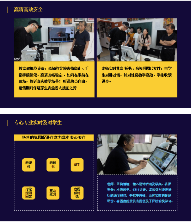 學生:看課件、看板書、舉手、討論提問和回答、互動練習、音視頻對話,熱烈的氛圍促進注意力集中 專心專注。