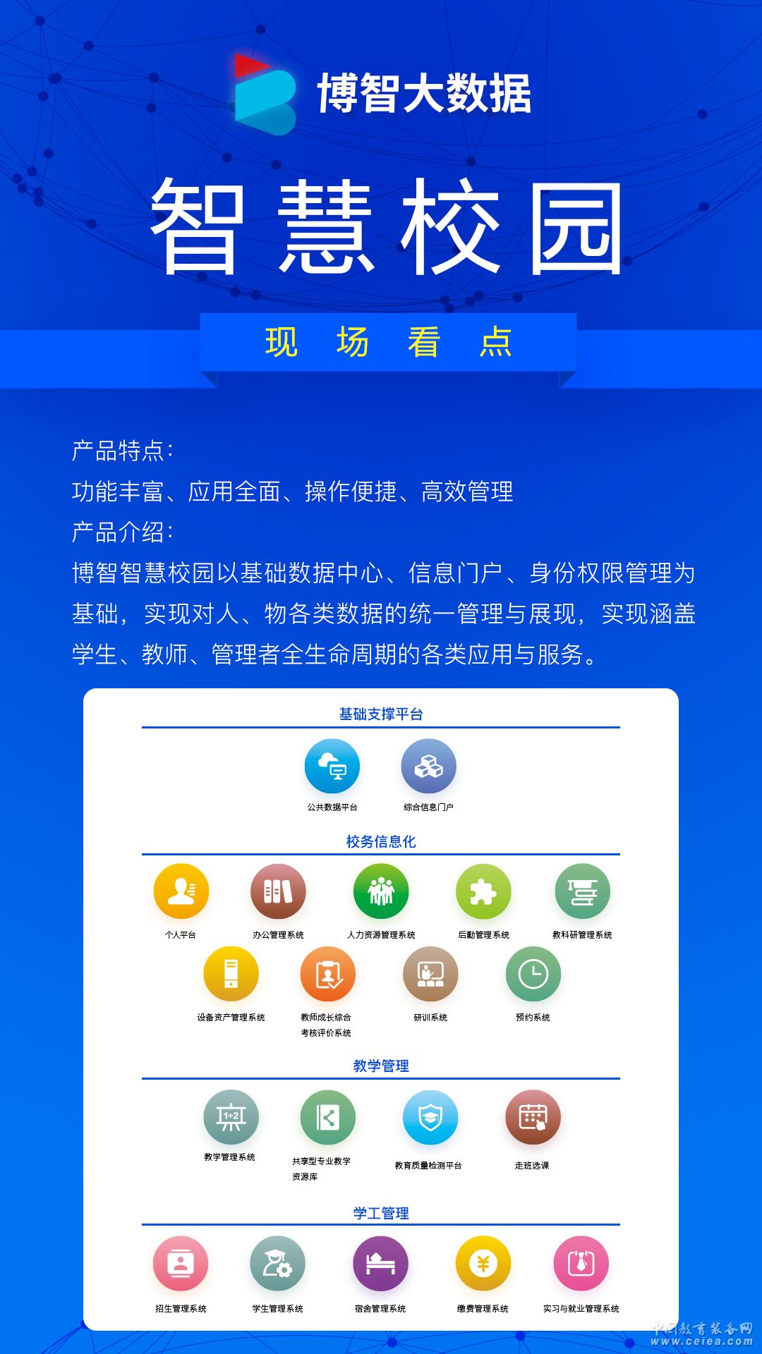 產品詳細介紹博智智慧校園,該產品功能豐富、應用全面、使用簡單、管理高效,涵蓋了綜合信息門戶,辦公管理系統、人力資源管理系統,后勤管理系統,教科研管理系統,設備資產管理系統,教師成長綜合考核評價系統,教學管理系統,共享型專業數據資源,招生管理系統,學生管理系統,宿舍管理系統,繳費管理系統,實習與就業管理系統。