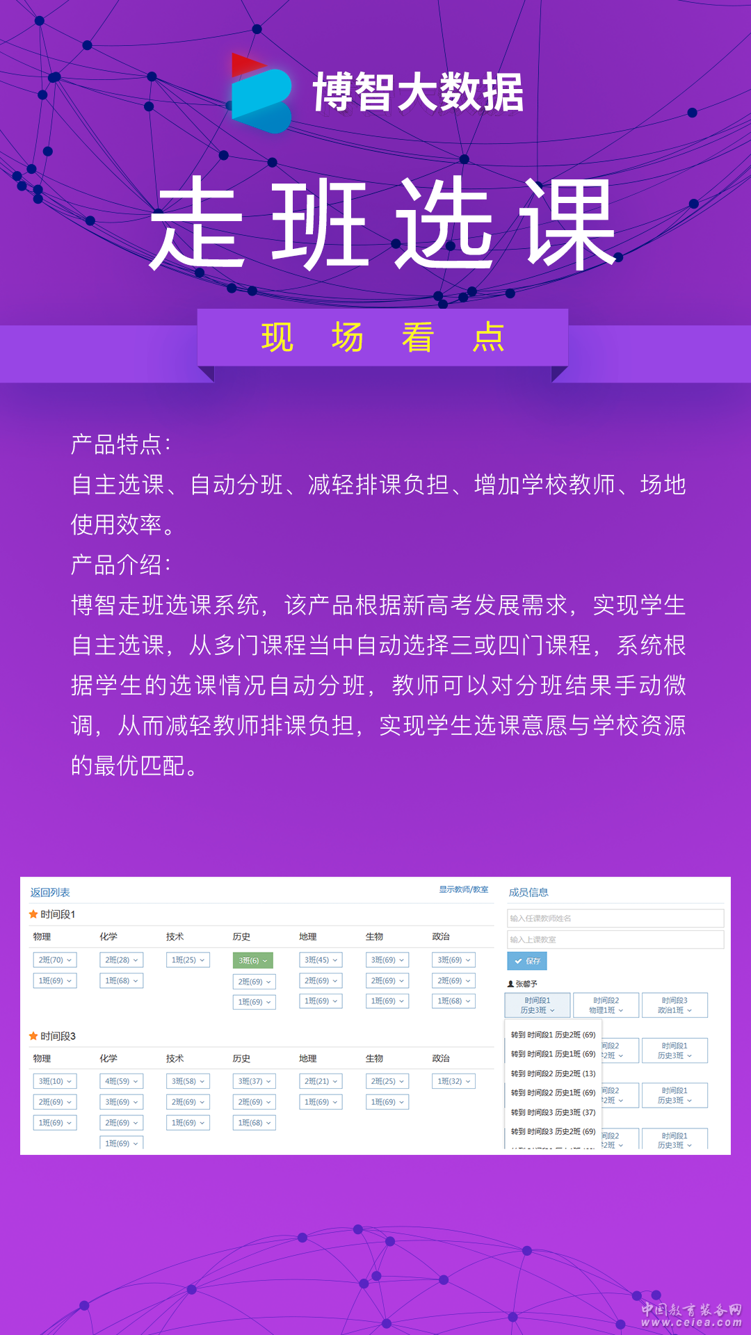 產品詳細介紹博智走班選課系統,該產品根據新高考發展需求,實現學生自主選課,從多門課程當中自動選擇三或四門課程,系統根據學生的選課情況自動分班,教師可以對分班結果手動微調,從而減輕教師排課負擔,實現學生選課意愿與學校資源的最優匹配。 產品特點: 自主選課、自動分班、減輕排課負擔、增加學校教師、場地使用效率。