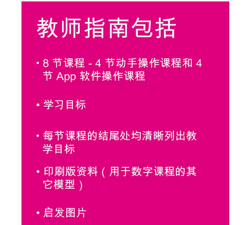 此外,隨箱附贈的教學入門資料包內還有:入門活動卡片、課堂海報,以及可用于搭建12個獨特積木模型的6張搭建啟發卡片哦。