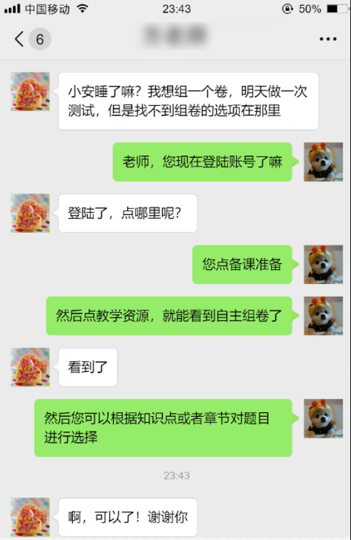 剛開始在線教學(xué)的那幾天,有青鹿的工作人員全程“保駕護(hù)航”。有一次批作業(yè)到了半夜十一點(diǎn)多,想布置明天的測(cè)試但是突然忘記資源庫里的題要怎么組卷,就發(fā)微信問青鹿工作人員,沒想到她還是很快響應(yīng),耐心地教我怎么用,能夠順利度過這段適應(yīng)期真的很感謝青鹿工作人員的積極配合。