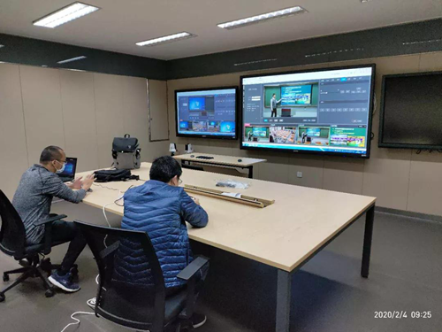學(xué)校領(lǐng)導(dǎo)在集控中心實(shí)時(shí)觀看名師直播教學(xué)情況