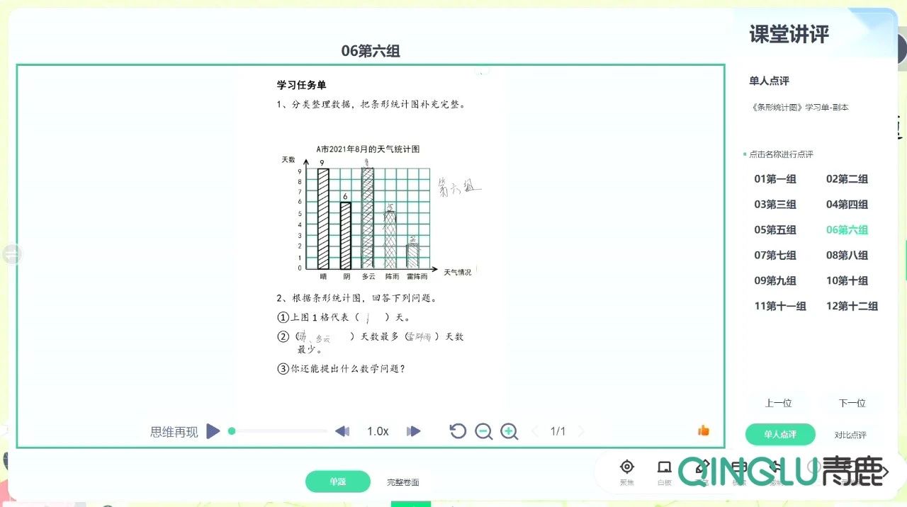 學生小組通過使用青鹿智能筆書寫探究成果,系統將實時傳輸書寫內容至一體機大屏;教師可以即時查看學生完成的情況,并更快速、精準地對作答情況進行講解分析,鞏固學生對條形統計圖課新學知識的理解。