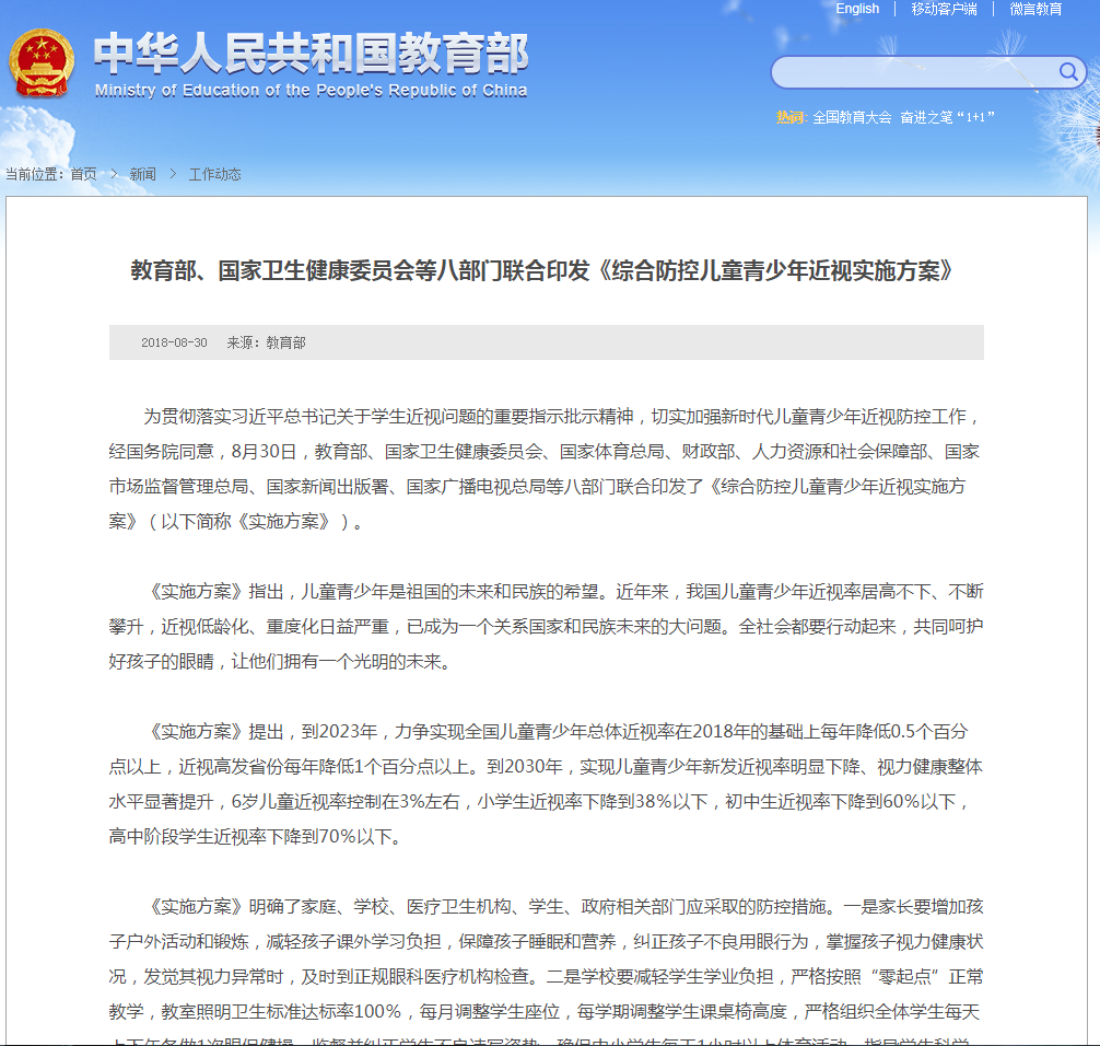 近年來,由于中小學生課內(nèi)外負擔加重,智能手機、平板電腦等電子產(chǎn)品普及,用眼過度、用眼不衛(wèi)生、缺乏體育鍛煉和戶外活動,社會上對兒童青少年近視防控工作和視力健康管理認識不足,公眾視覺健康知識匱乏和視覺健康領(lǐng)域政策保障薄弱,各部門協(xié)同配合不夠等因素,我國兒童青少年近視問題越發(fā)嚴重,近視率居高不下、不斷攀升且呈現(xiàn)低齡化、重度化、發(fā)展快、程度深的趨勢。2014年全國學生體質(zhì)與健康調(diào)研結(jié)果顯示,我國各學段學生近視率持續(xù)上升,7―12歲小學生、13―15歲初中生、16―18歲高中生視力不良率分別為45.71%、74.36%、83.28%。2018年6月,國家衛(wèi)生健康委通報,我國兒童青少年近視率已居世界第一。