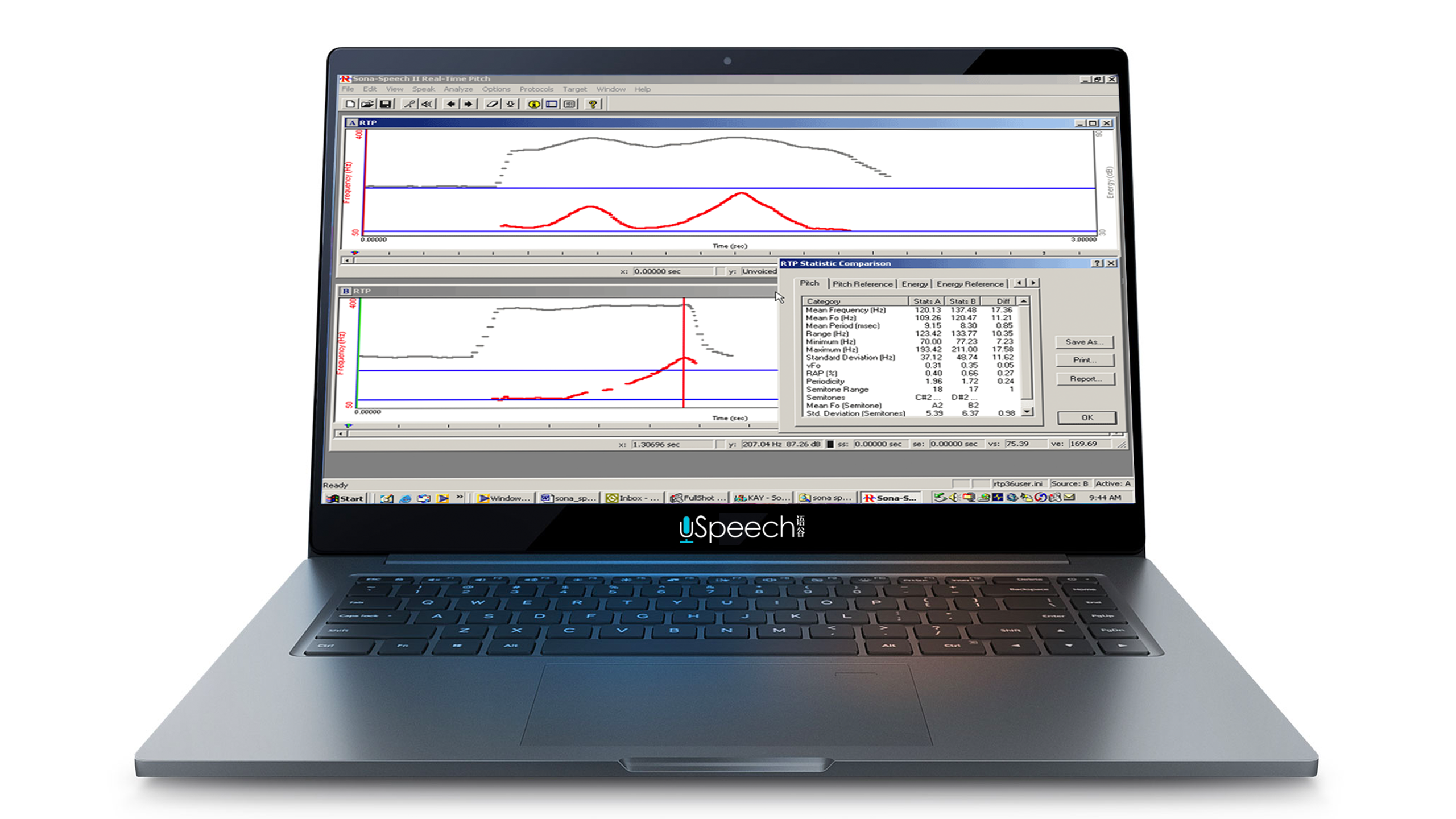 實(shí)時(shí)音高 Sona-Speech 的一個(gè)關(guān)鍵模塊是實(shí)時(shí)音高,在運(yùn)動(dòng)言語過程中的重音、計(jì)時(shí)、語調(diào)模式以及目標(biāo)音高和/或振幅值可以被客戶看到。分屏允許將目標(biāo)發(fā)聲與客戶模仿關(guān)鍵參數(shù)(如振幅水平、語音速率、音高范圍等)的嘗試進(jìn)行比較。然后可以視覺和定量地比較目標(biāo)和客戶的嘗試;音頻回放允許臨床醫(yī)生和客戶精確地傾聽重要的語音/嗓音行為。