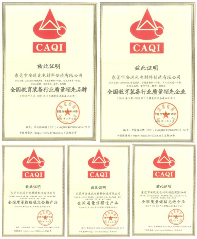 2021年,安道教育還連續(xù)斬獲“全國教育裝備行業(yè)質量領先品牌”“全國教育裝備行業(yè)質量領先企業(yè)”“全國質量誠信先進企業(yè)”“全國質量信得過產(chǎn)品”“全國質量檢驗穩(wěn)定合格產(chǎn)品”等榮譽。