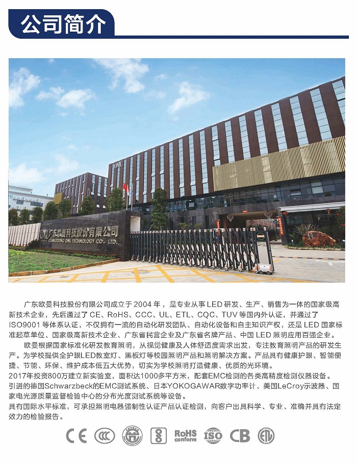 廣東歐曼科技股份有限公司始成立于2004年,是專業(yè)從事LED研發(fā)、生產(chǎn)、銷售為一體的國家級高新技術(shù)企業(yè),先后通過了CE、ROHS、CCC、UL、CQC、TUV等國內(nèi)外認(rèn)證,并通過了ISO9001等體系認(rèn)證,不僅擁有一流的自動化研發(fā)團隊、自動化設(shè)備和自主知識產(chǎn)權(quán),還是LED國家標(biāo)準(zhǔn)起草單位、國家級高新技術(shù)企業(yè)、廣東省民營企業(yè)及廣東省名牌產(chǎn)品、中國LED照明應(yīng)用百強企業(yè)。
