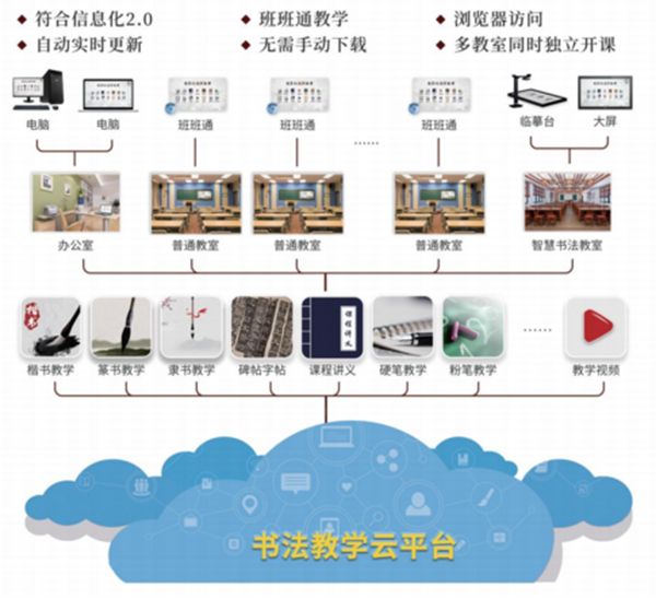 漢丹云智慧書法基于“互聯網+教育”理念研發,全面服務于學校書法教育。產品采用云服務架構,保證軟件產品內容實時的自動更新,讓學校能夠永久享受到互聯網+教育的便捷性。同時基于云平臺,賦能書法教學系統,提供網頁版書法教學云平臺,只需借助瀏覽器即可讓普通教室的班班通大屏也可以開展書法教學工作,不需額外安裝其他硬件設備和軟件系統,維護方便,使用簡單,解決了書法教室排課緊張,學生沒有書法練習場所的問題,實現了“智慧書法教室”學書法,“普通教室”練書法的新思路,最大化學校書法教室的建設價值。