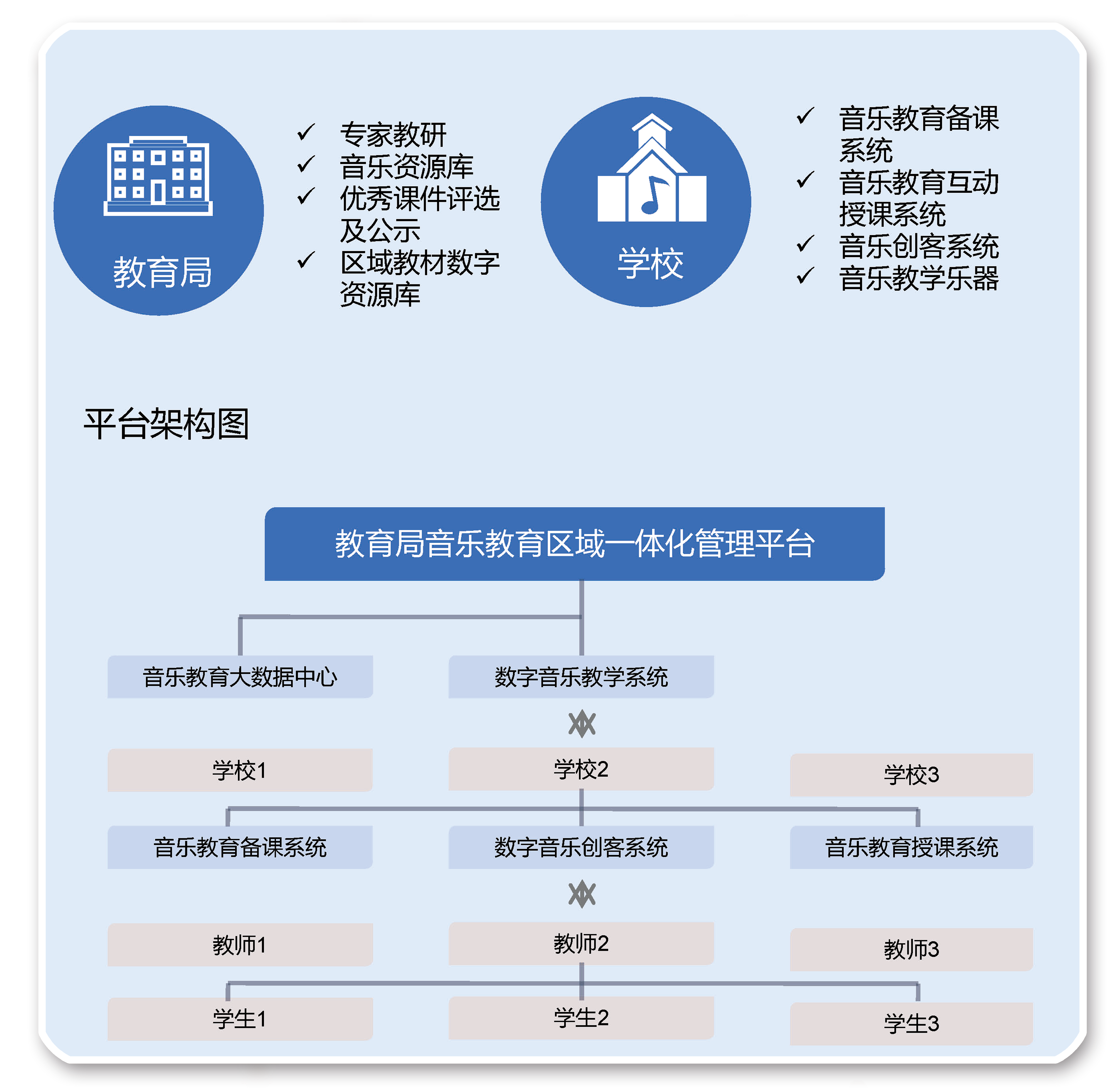美育教育區域一體化管理平臺由數字音樂教學系統和音樂教育區域大數據中心組成,幫助市/區/縣教育局建設成覆蓋所有下轄學校的統一的音樂教育大平臺,打造區域音樂教育大數據中心,輔助區域打通音樂教育壁壘,支持區域內學校開好音樂課、開足音樂課。