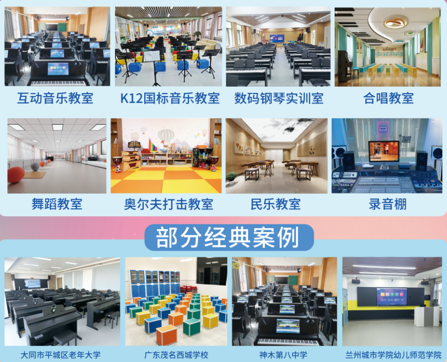 智慧音樂教室一站式服務提供商,可提供針對幼兒園、K12、職業教育等相關的音樂器材室、MIDI教室、錄音棚、數碼鋼琴實訓室、音樂創客教室及舞蹈教室、少隊部、各類民樂教室和管樂教室等