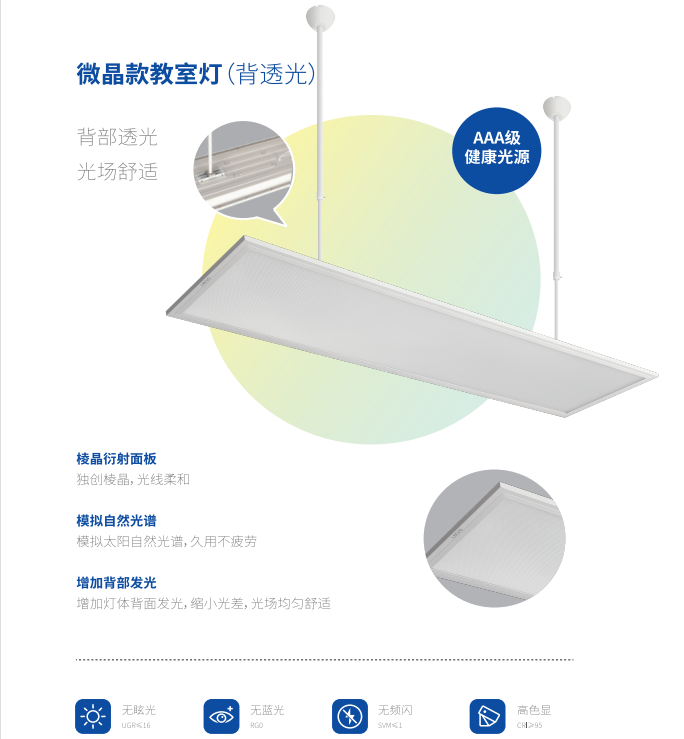 1 光源及數(shù)量 2 色溫 5000K 3 總光通量 3000Lm 4 防眩指數(shù) UGR <16 5 顯色指數(shù) Ra>95 R9>95 藍(lán)光危害 RG0