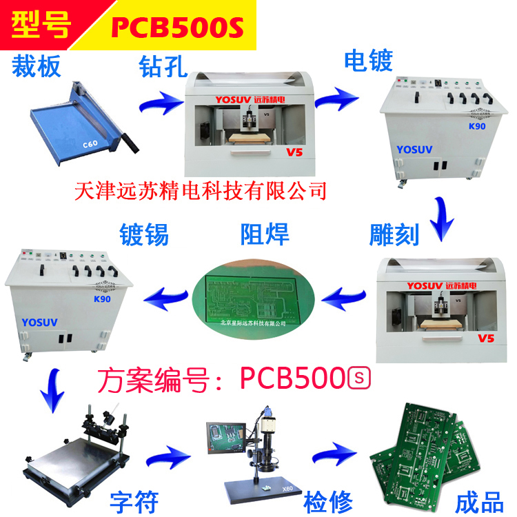 工藝目的: 裁板:將覆銅板通過精密裁板機裁成所需尺寸,一般比所需要尺寸多出來1CM邊框。 鉆孔:根據(jù)軟件提示,將PCB板上所有的孔通過雕刻機鉆出所需的孔。 孔金屬化:用過孔電鍍系統(tǒng)對PCB板上的孔進行金屬化處理。 雕刻:用PCB雕刻機對覆銅板進行雕刻,雕刻出所需的線路。 阻焊:用曝光機對雕刻好的PCB板進行曝光,將曝光好的PCB板進行綠油阻焊。 字符:用絲印機對做好阻焊的PCB板進行字符的絲印。 板面處理:將做好的線路板進行表面處理,便于焊接。 檢修:通過視頻檢測儀處理表面細微金屬碎屑,以便于達到最佳效果。 設備配置: (1)裁板機C60 產(chǎn)品概述: 遠蘇科技是國內(nèi)頂級PCB雕刻機生產(chǎn)制造商,專注于國內(nèi)外高端企業(yè)及學校客戶的精密研發(fā)制板需求,提供用于對覆銅板進行鉆孔、雕刻、外形銑割的線路板雕刻機及相關(guān)設備。 ________________________________________ 技術(shù)參數(shù) 最大切板尺寸 345mm 外形尺寸 480*330*180mm 重量 12kg ________________________________________ 產(chǎn)品亮點 • 特制鋼長壽命刀刃,耐用性強,獨特的省力杠桿式設計,輕松切割各種厚板材。 • 流線型的外觀符合人體工程學的設計。 • 配置水平對位功能,可以方便的切割固定形狀的PCB板。 • 最大切割長度345mm,最大切板厚度3mm。 • 具有對位和固定標尺,精度更高,使用更方便。 • 防誤傷安全裝置,固定透明保護罩,既保證不會誤傷手指,同時也可以清晰觀查切板過程及切板質(zhì)量。 ________________________________________ 產(chǎn)品用途 C60高精度裁板機主要用于PCB制板工藝過程中線路板的裁切工藝,流線型的外觀設計,獨特的省力桿設計及防誤傷裝置,讓操作者能夠安全輕松的裁板。 (2) 過孔電鍍機K90 產(chǎn)品概述: 遠蘇科技是國內(nèi)頂級PCB雕刻機生產(chǎn)制造商,專注于國內(nèi)外高端企業(yè)及學校客戶的精密研發(fā)制板需求,提供用于對覆銅板進行鉆孔、雕刻、外形銑割的線路板雕刻機及相關(guān)設備。 ________________________________________ 技術(shù)參數(shù) 最大板面 300*300mm 最小孔徑 0.3mm 最大厚徑比 2.5:1 輸出電流 0-15A 工作電壓 220V/50HZ 外形尺寸 880mm(L)×600mm(W)×920mm(H) 重量 90kg ________________________________________ 產(chǎn)品亮點 • 電鍍液微循環(huán)系統(tǒng):內(nèi)置兩套微孔發(fā)泡管和靜音氣泵使電鍍液形成微循環(huán),提高過孔電鍍的質(zhì)量。 • 電鍍件往復運動功能:通過調(diào)速,可控制電鍍速度。 • 環(huán)保無污染:K90采用新型環(huán)保黑孔化直接電鍍工藝,安全、可靠、高效。黑孔液不含有傳統(tǒng)的化學鍍銅成分,取消甲醛和危害生態(tài)環(huán)境的化學物質(zhì)在配方中的使用,屬于環(huán)保型產(chǎn)品。 • 操作便捷:產(chǎn)品槽體采用耐酸堿材料,恒溫裝置采用鈦加熱管,能自動恒溫,槽體工作時間、溫度可預設,操作簡易方便,自動化程度高,貫孔導通率100%。 • 一體化的設計:使整機結(jié)構(gòu)緊湊。 • 密封式的設計:保證電鍍液不受污染,保證電鍍質(zhì)量。 ________________________________________ 產(chǎn)品用途 K90過孔電鍍機,又稱孔化機,鍍銅機,在PCB物理快速制板工藝中主要用于對線路板上的孔進行金屬化處理。較常用于雙面板線路板的貫孔沉銅工藝。將完成鉆孔的覆銅板置于本機中,設置好相關(guān)參數(shù),即可輕松快速的完成金屬孔化工藝,機器帶有加熱,鼓氣及電鍍功能。 (3)線路板雕刻機V5 產(chǎn)品概述: 遠蘇科技是國內(nèi)頂級PCB雕刻機生產(chǎn)制造商,專注于國內(nèi)外高端企業(yè)及學校客戶的精密研發(fā)制板需求,提供用于對覆銅板進行鉆孔、雕刻、外形銑割的線路板雕刻機及相關(guān)設備。 ________________________________________ 技術(shù)參數(shù) 加工范圍 雙面板/單面板 加工面積 305×305mm 最小加工線徑 3mil(0.075mm) 最小加工線距 5mil(0.127mm) 分辨率 0.03mil(0.75um) 工作速度 6m/min 主軸轉(zhuǎn)速 0~60000r/min,無級調(diào)速,軟件自動優(yōu)化轉(zhuǎn)速 主軸功率 92W 直線導軌 進口直線導軌 傳動方式 進口滾珠絲桿 鉆孔孔徑 0.3~3.175MM 鉆孔深度 0.02-3.5mm 鉆孔速度 150(孔/min) 控制方式 電腦控制 通信方式 RS-232/USB 操作系統(tǒng) Windons 98/2000/XP/Vista/7/10 最小內(nèi)存配置 256MB 體積 750mm(L)×660mm(W)×660mm(H) 重量 110kg 消耗功率 250 W 電源 220V/50HZ 支持軟件 支持Protel99se、DXP、Altium Designer、Eagle、Pads、Proteus、CAD等常用EDA軟件(支持所有pcb及gerber格式的文件) ________________________________________ 產(chǎn)品亮點 自動原點定位:可以從任意位置自動回到設定的零點,擁有原點記憶功能。 雙面板自動定位技術(shù):保證了定位的精確性與正確性。 斷點續(xù)雕:從任意百分比開始雕刻,或雕刻到某一百分比結(jié)束。 模擬運行:根據(jù)設定的參數(shù),仿真顯示實際加工過程。 實時顯示加工路徑:加工前首先顯示所有加工路徑,在加工過程中實時顯示當前位置。 任意區(qū)域選擇雕刻:選擇任意區(qū)域,進行雕刻。 組合雕刻/自動選擇刀具:選擇兩把雕刻刀,自動分配雕刻區(qū)域。在不影響雕刻精度的情況下選擇一把大雕刻刀,快速銑掉大塊的空白區(qū)域。 萬能鉆孔:使用固定銑刀挖出任意孔,減少了換鉆頭的次數(shù)。 外形銑割:板子雕刻完成后進行外形銑割。 智能主軸轉(zhuǎn)速優(yōu)化功能:根據(jù)刀具自動優(yōu)化主軸轉(zhuǎ