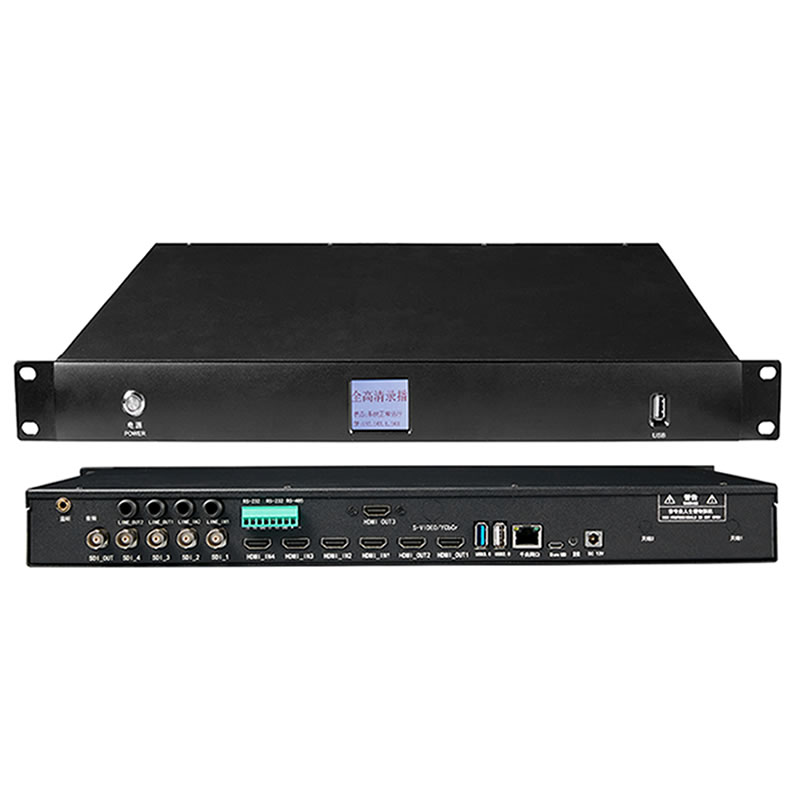 產品主要功能: 1. 系統結構:一體嵌入式結構;1U機架式全鋁機箱;2個內部3.5寸 SATA盤位; 2. 視頻采集:硬件采集方式;視頻輸入接口: HDMI*4(支持4KP30或1080P60)+4*3GSDI/HDSDI;輸入分辨率:640x480 ~ 3840*2160,支持自動偵測分辨率及幀率功能,不但支持常見的4k,1080P60/50,1024x768@60fps等常見的分辨率,也支持1080P25/P30等分辨率 3. 支持2路3.5音輸入或8路輸入都支持HDMI信號帶內嵌音頻,或者SDI信號視頻帶音頻的輸入。 4. 支持2路3.5音頻輸出,支持1個3.5音頻監聽接口,支持 4K H265或H264編碼及解碼; 5. 支持2個USB2.0接口,1個接U盤導出文件,1個USB2.0接鼠標,不用接網絡即可直接操控本地回放及文件導出等操作; 6. 支持外接13寸或23寸觸摸屏顯示圖像及觸控,實現所見及所得的導播效果; 7.視頻輸出:3路4K HDMI(其中 1 路支持 4K@60) 8. 錄制格式:MP4; 9. 錄播功能:單獨錄制/同步錄制/同步直播/在線點播/遠程導播/本地導播/互動錄播; 10. 錄播模式:多流多畫面(資源模式)/單流單畫面(電影模式)/單流多畫面(畫中畫); 11. 支持8路rtsp/ts流解碼,分辨率支持4k,解碼流可進行導播后錄制,直播及點播,支持解碼流全屏顯示及聲音單獨輸 12. 支持rtmp/http ts/udp ts/rtsp直播協議,內嵌rtmp server功能,不需要安裝fms/red5等服務端軟件直接實現網頁直播; 13. 支持瀏覽器直接觀看直播并不用裝插件,支持html5點播; 14. 提供遠程導播軟件,可實時監控8畫面并實時導播一路導播流,并實時錄制,且同時支持網頁按紐導播; 15. 支持疊加2行字幕疊加,每行字幕可設置開關,字體大小,色彩,坐標,并能支持中英文;支持字幕滾動功能。 16. 支持透明背景logo圖片疊加, 17.支持常用特技功能,包括摳像 、淡入淡出等功能; 18.無縫切換,支持單畫面與單畫面切換;支持單畫面與畫中畫、1/2/3/4/5/6 分屏切換,支持分屏與分屏之 間切換 切換特效:支持淡入淡出、及 8 鐘以上不同切換特效功能 19.支持跟蹤攝像機接入自動導播功能 20. 每路錄制文件及直播流均支持1080p60幀H265或H264編碼,幀率提高一倍從而可使效果得到極大的提升,徹底消滅切幀現象;HDMI支持4k分辨率及4k分辨率直播,錄制及點播; 21. 支持開機就錄,硬盤錄滿會自動循環覆蓋時間最老文件,支持自動分段且分段時間可設置,徹底實現無人值守的全自動錄播;支持ftp自動上傳至指定帳號及密碼的ftp服務器; 22. 支持軟件開關機功能,無需重啟錄播即可通過軟件實現開機、關機、重啟等功能, 23.程序固化在內置芯片中,穩定高效,使用嵌入式Linux系統,不會中毒,可隨時斷電及長時間開機。 24. 支持多級用戶管理,分管理員用戶和一般用戶 25. 網絡媒體直播延時:<=3秒 主要應用: 教學錄播,常態錄播,精品錄播 、會議錄播 醫療示教導播臺/多機位直播/錄制 1.2 產品規格 設備參數 性能指標 操作語言 中文 操作界面 圖形化菜單操作界面 系統結構 嵌入式 Linux 系統 B/S 架構 本地操控一 HDMI 顯示器 + USB 鼠鍵(實時視頻預覽設換) 遠程操控二 IE//火狐/搜狗/360 等瀏覽器上 IP 登陸 系統維護及升級 遠程網絡升級。 視頻輸入接口 4路4K HDMI + 4路3G-SDI(1080P60) 輸入分辨率/幀 所有通道輸入視頻時自動檢測分辨率及幀率輸入。分辨率:3840*2160(HDMI信號輸入)/1920*1080/1280*720@25/30/50/60 視頻輸出接口 3路4K HDMI(其中 1 路支持 4K@60) 輸出信號流 高清數字信號 H.265/H.264 可選 TS HTTP/UDP/RTSP/RTMP 流 H.265/H.264IP流輸入 最多支持 8 路 1080P 的 H.265 IP流實時輸入,可使用海康/大華/三星/sony 等網絡攝像機輸入。 音頻輸入接口 2路Line in立體聲輸入。支持外置音頻或視頻自帶音頻 音頻輸出接口 2路Line out立體聲輸出,1路監聽輸出 音頻編碼格式 AAC 錄音方式 視頻和音頻同步錄制。 播放錄像 通過遠程 IE 瀏覽器網頁方式播放或下載文件后播放。支持本地回放 錄制文件下載 后臺遠程下載或本地U盤拷貝 數據存儲模式 內接 2 個 SATA 硬盤 exFAT 分區、外接 USB 存儲 最大支持單硬盤8TB,支持存儲到 Win 或 NFC 網絡共享路徑。 角標 LOGO 疊加 支持預設四個角標,角標大小和位置可以任意調節疊加。 OSD 字幕疊加 支持字幕發布:字幕位置,字體樣式,字號大小可調。 分屏功能 PGM 合成通道支持分屏畫面設換輸出,并提供多種預設樣式選擇功能。 截屏功能 PGM 合成通道視頻的截屏圖像保存 實時切換 所有視頻及流輸入通道能任意兩個無縫切換輸出導播或直播流。