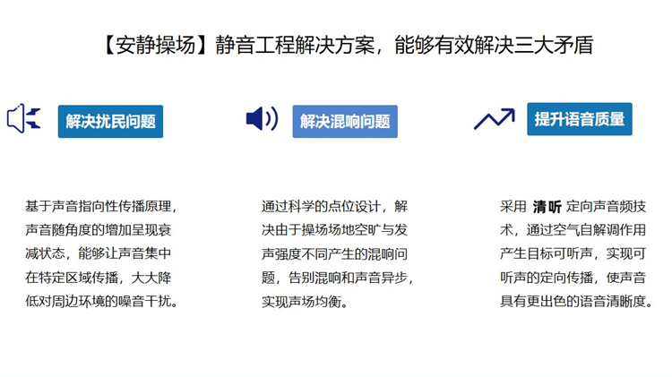 清聽聲學安靜操場系統(學校定向音柱),采用全球領先的定向發聲技術、局域聲場控制技術和云端架構,解決了校園廣播擾民問題,為校園社區和諧帶來了全新聲體驗。